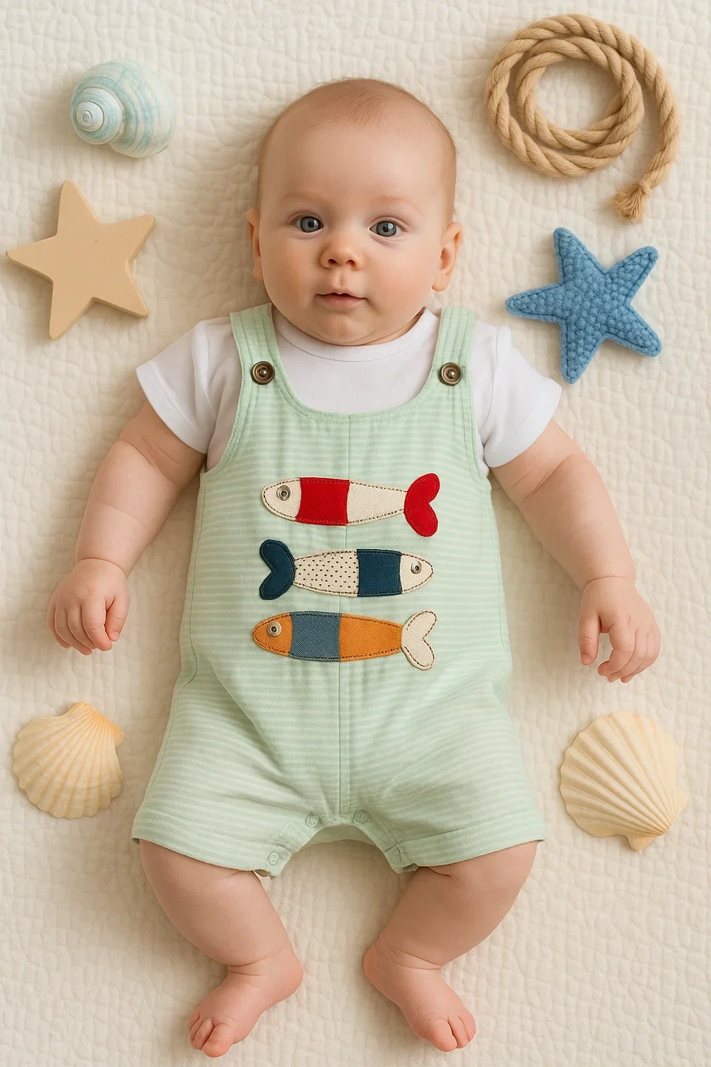 Balık Nakışlı Kısa Kollu Erkek Bebek Tulumu