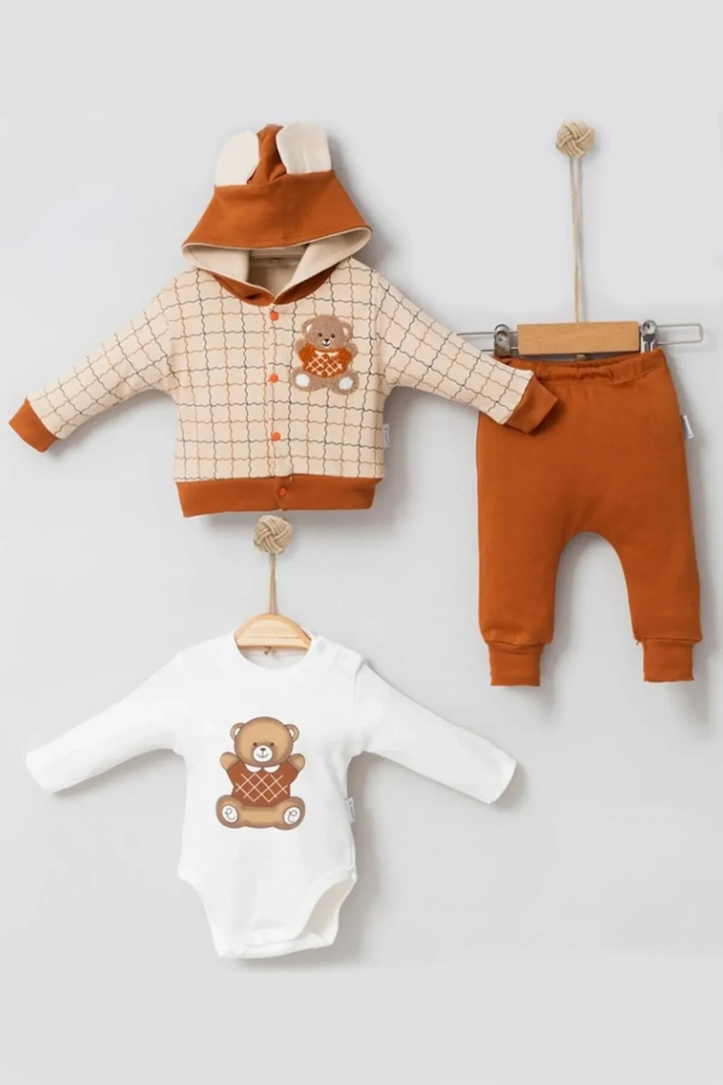 Peluş Ayıcık Desenli Kapişonlu 3'lü Erkek Bebek Takımı