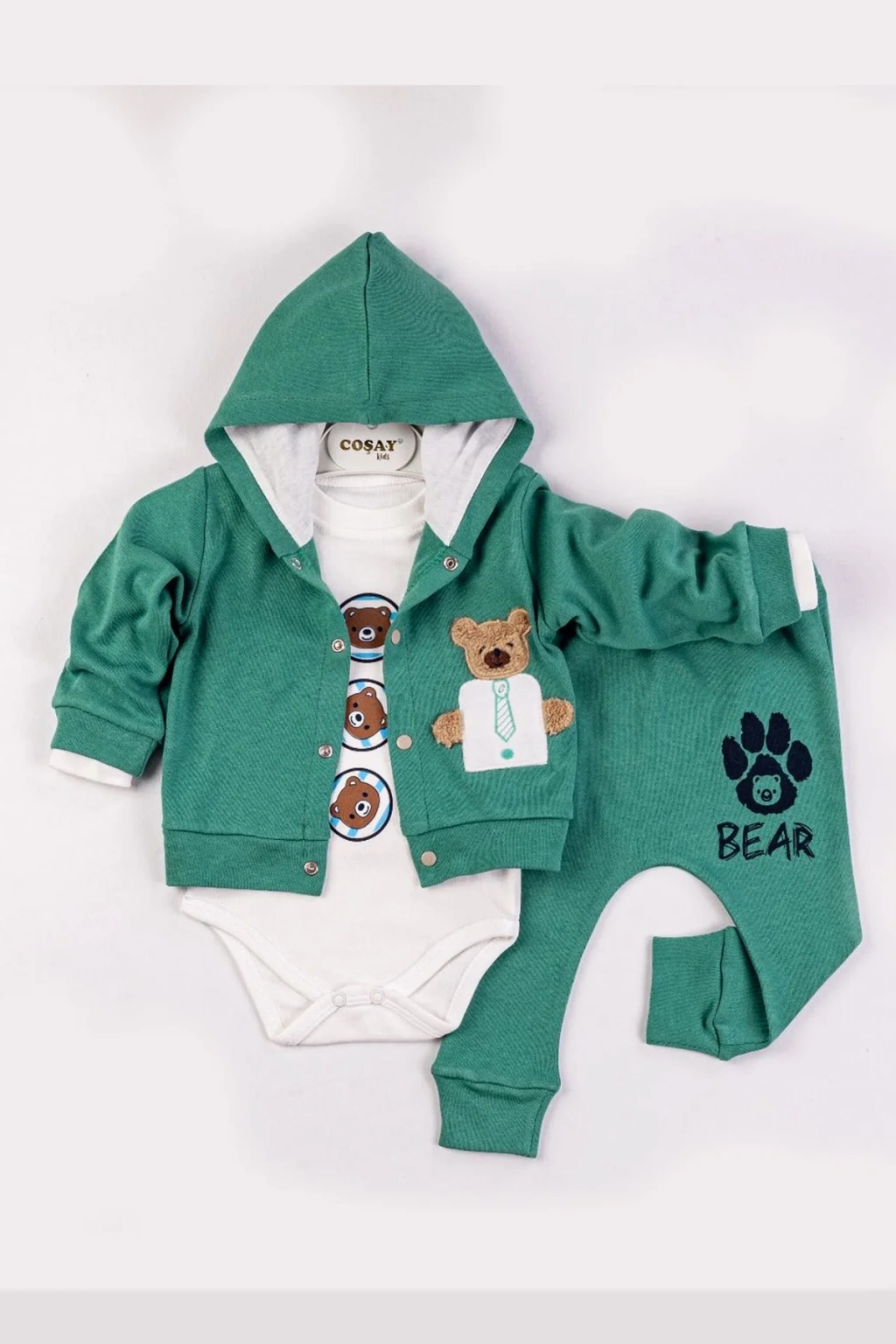 Bear Nakışlı Yelekli 3'lü Erkek Bebek Takımı