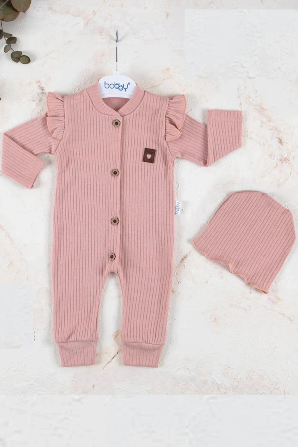 Boydan Düğmeli Şapkalı % 100 Pamuk Kız Bebek Tulumu