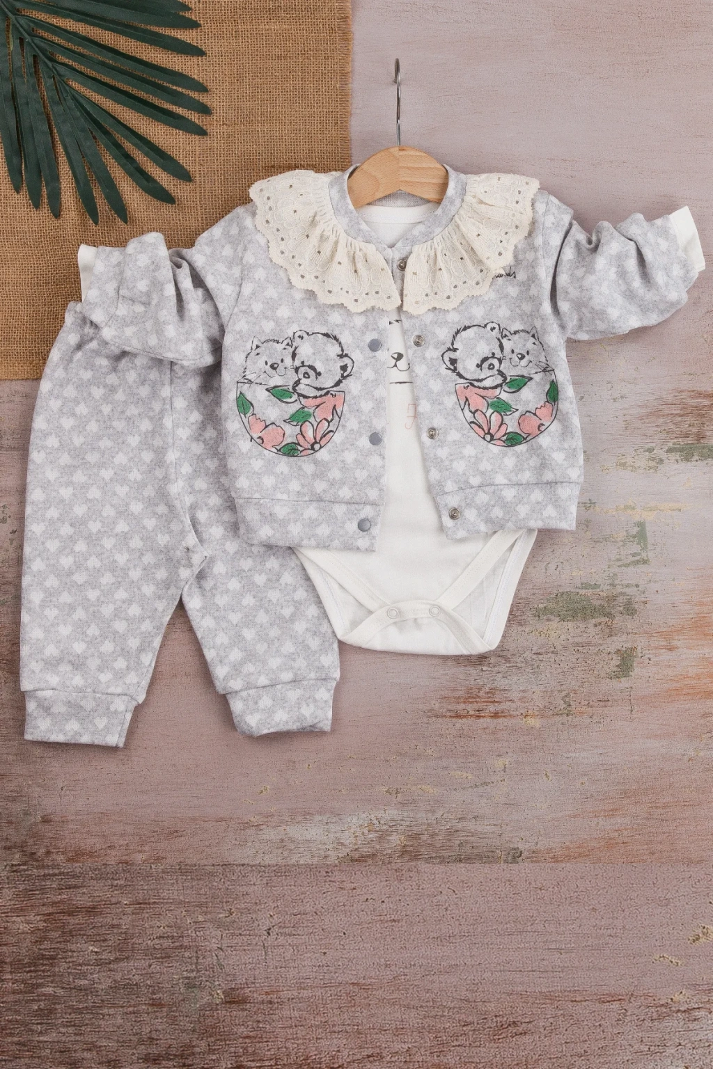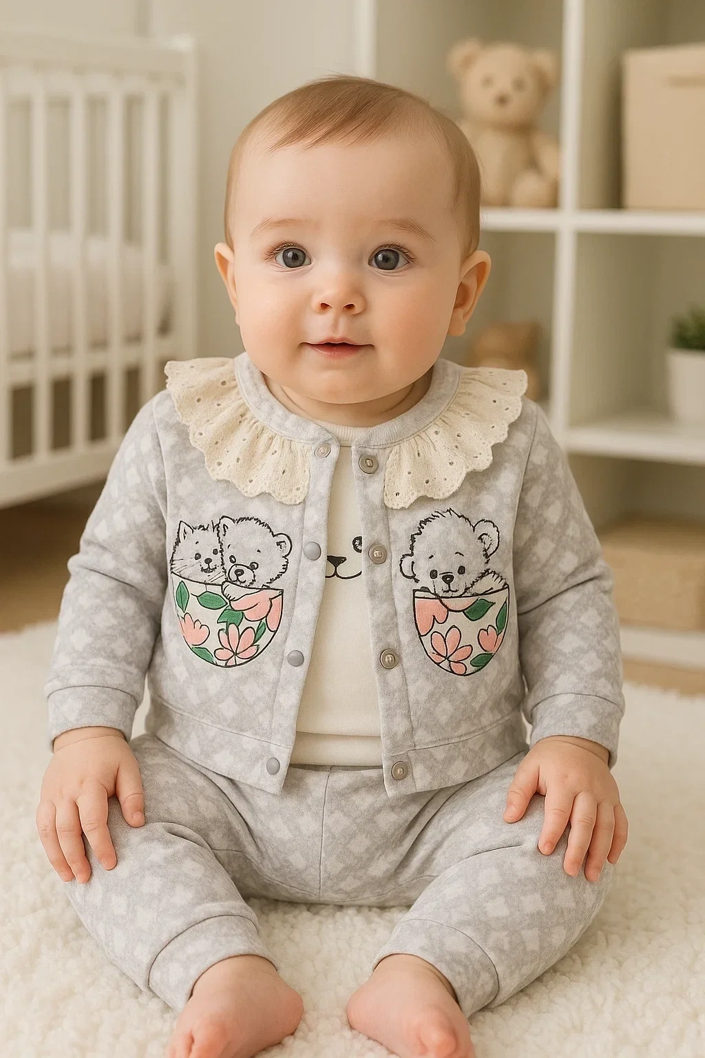 Elma Desenli Ceketli 3'lü Kız Bebek Takımı