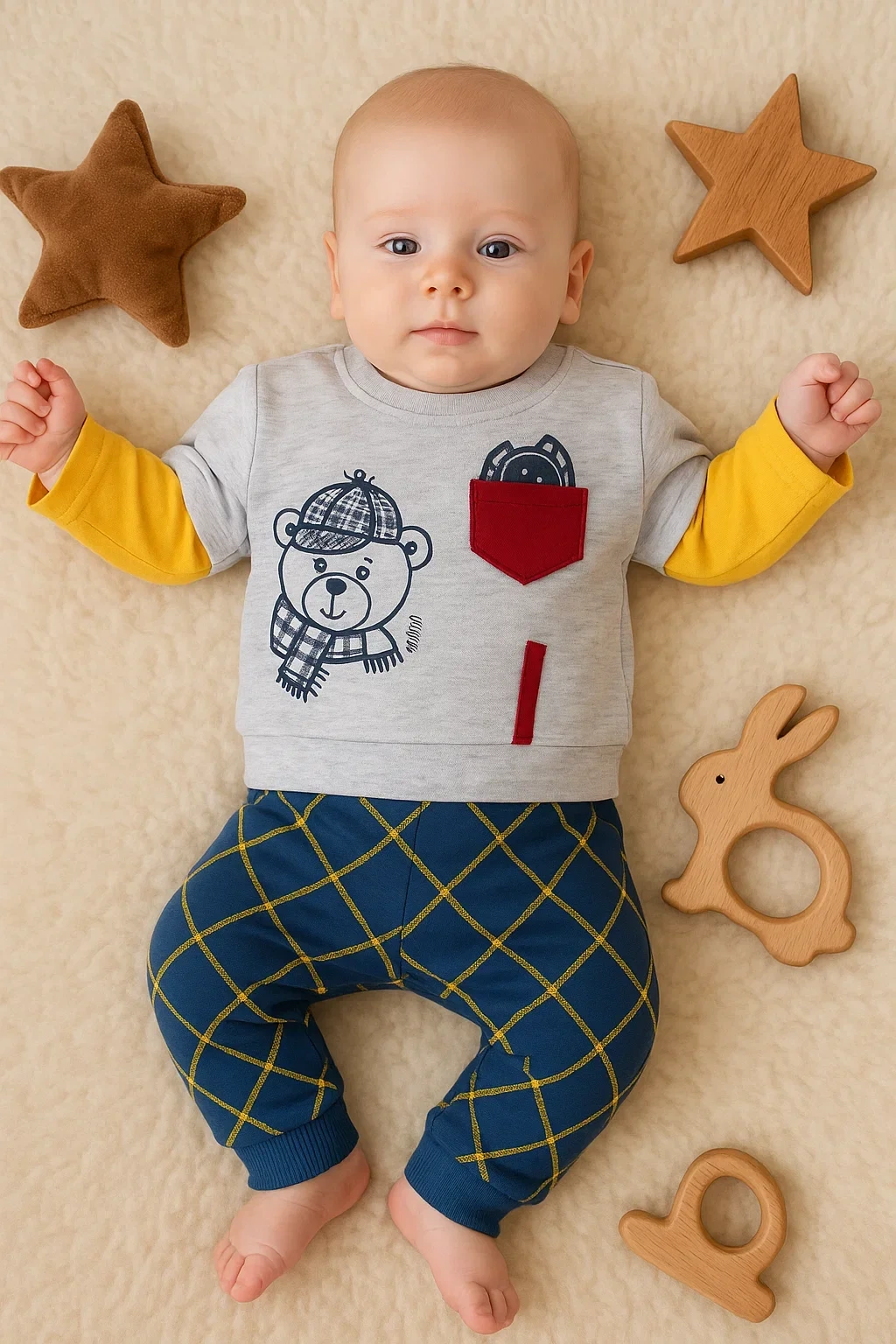 Bear Gofre Kabartmalı 2'li Erkek Bebek Takımı