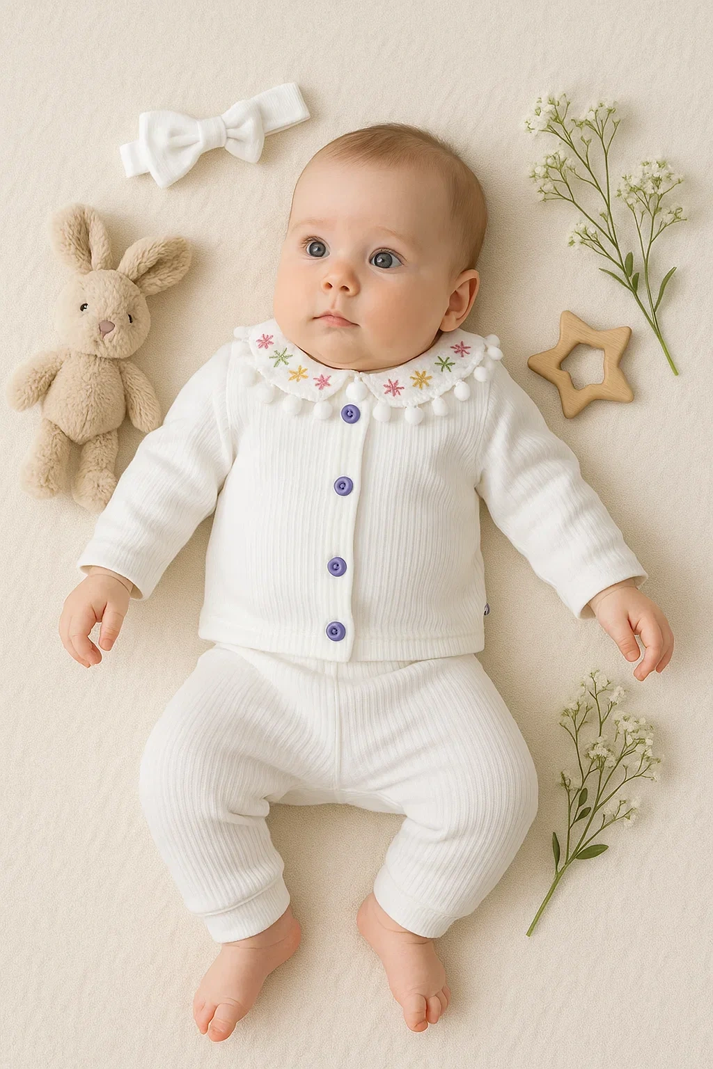 Çiçek Nakışlı Düşmeli Bandanalı Kız Bebek Takımı