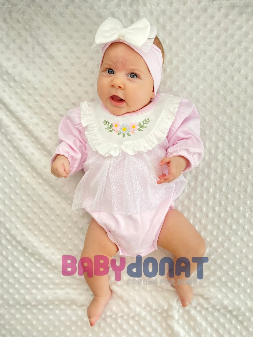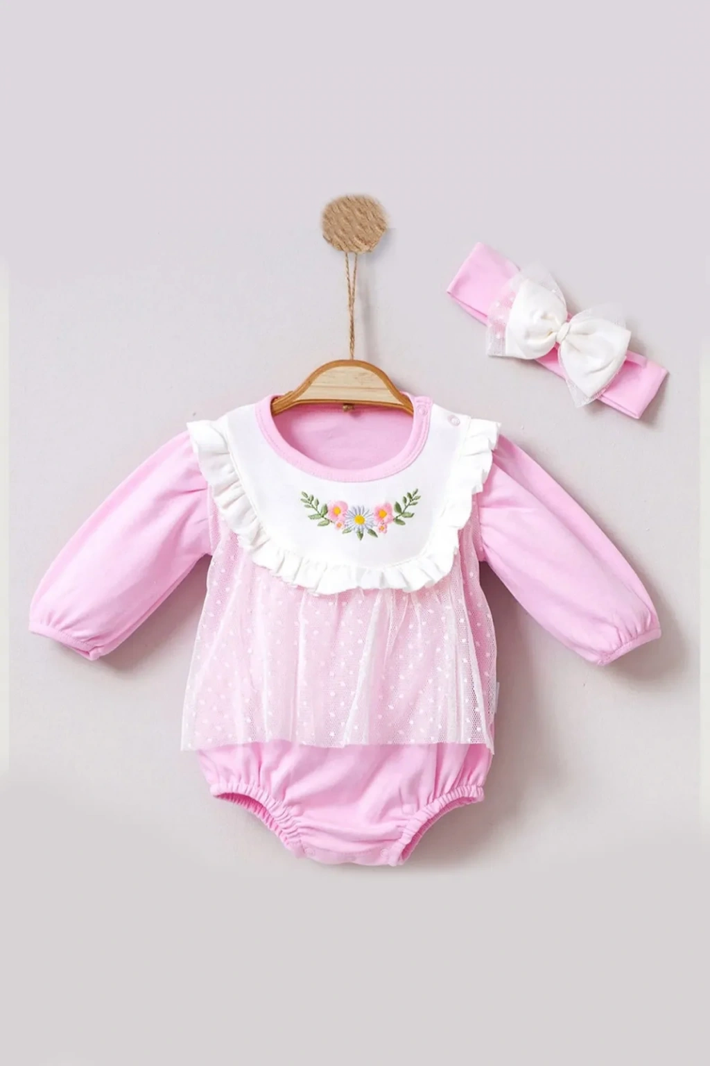 Çiçek Nakışlı Tüllü Bandanalı Kız Bebek Romper