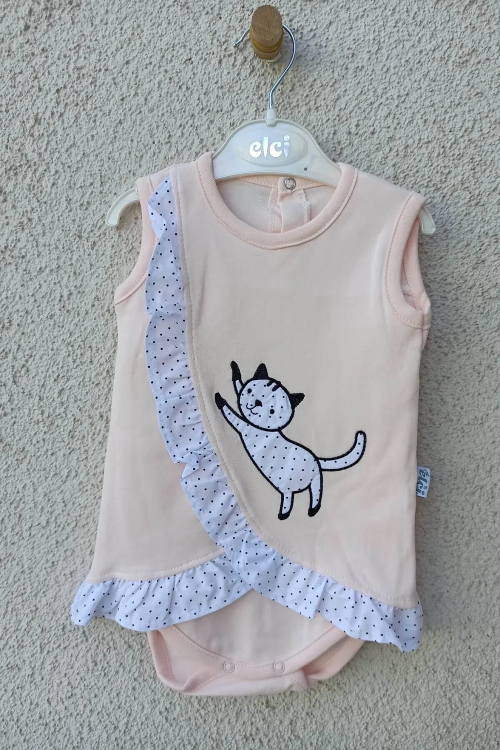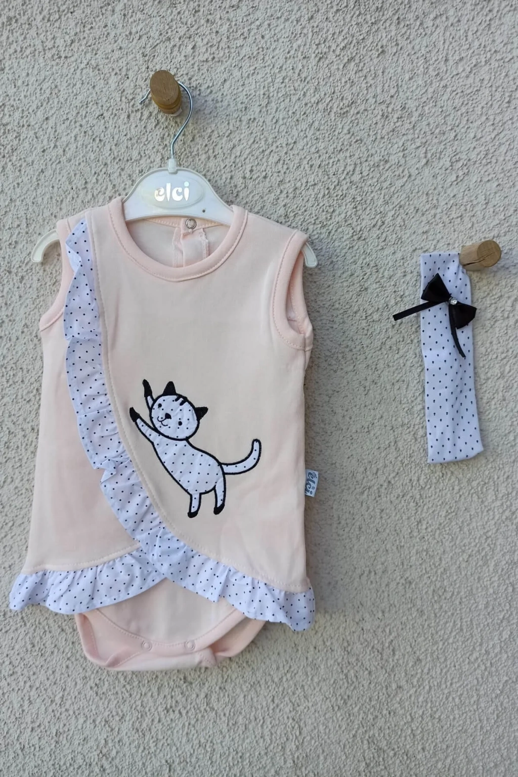 Kız Bebek Pembe Kedili Fırfırlı Bandanalı Badi