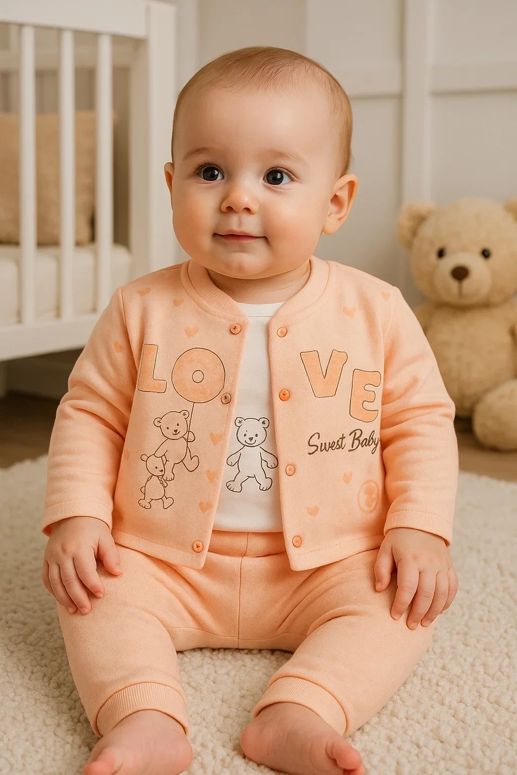 Love Tavşan Desenli Kol Detaylı 3'lü Hırkalı Kız Bebek Takım