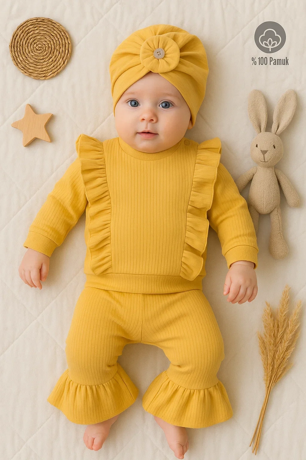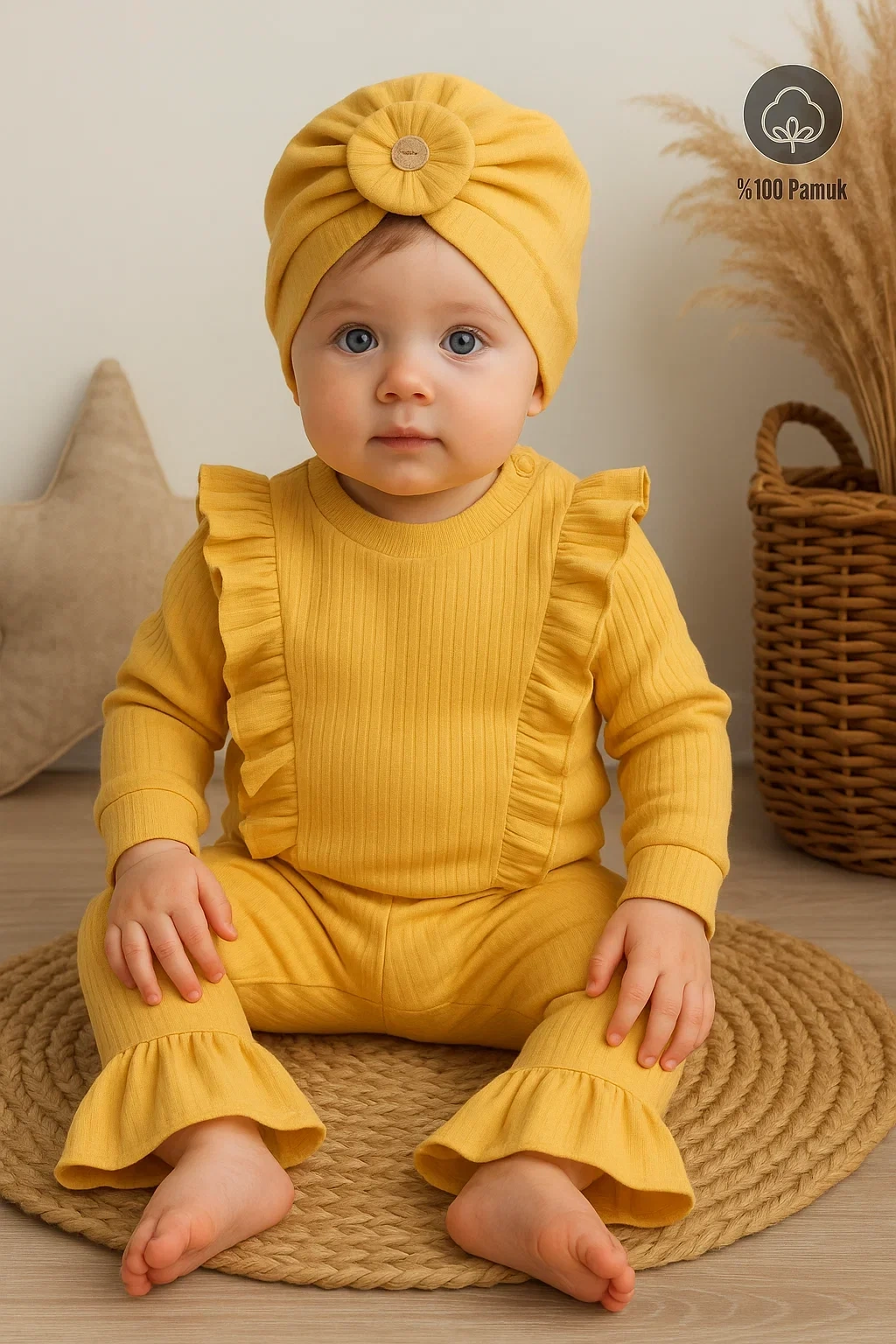 Omuzdan Fırfır Detaylı Boneli 3'lü % 100 Pamuklu Kız Bebek Takımı