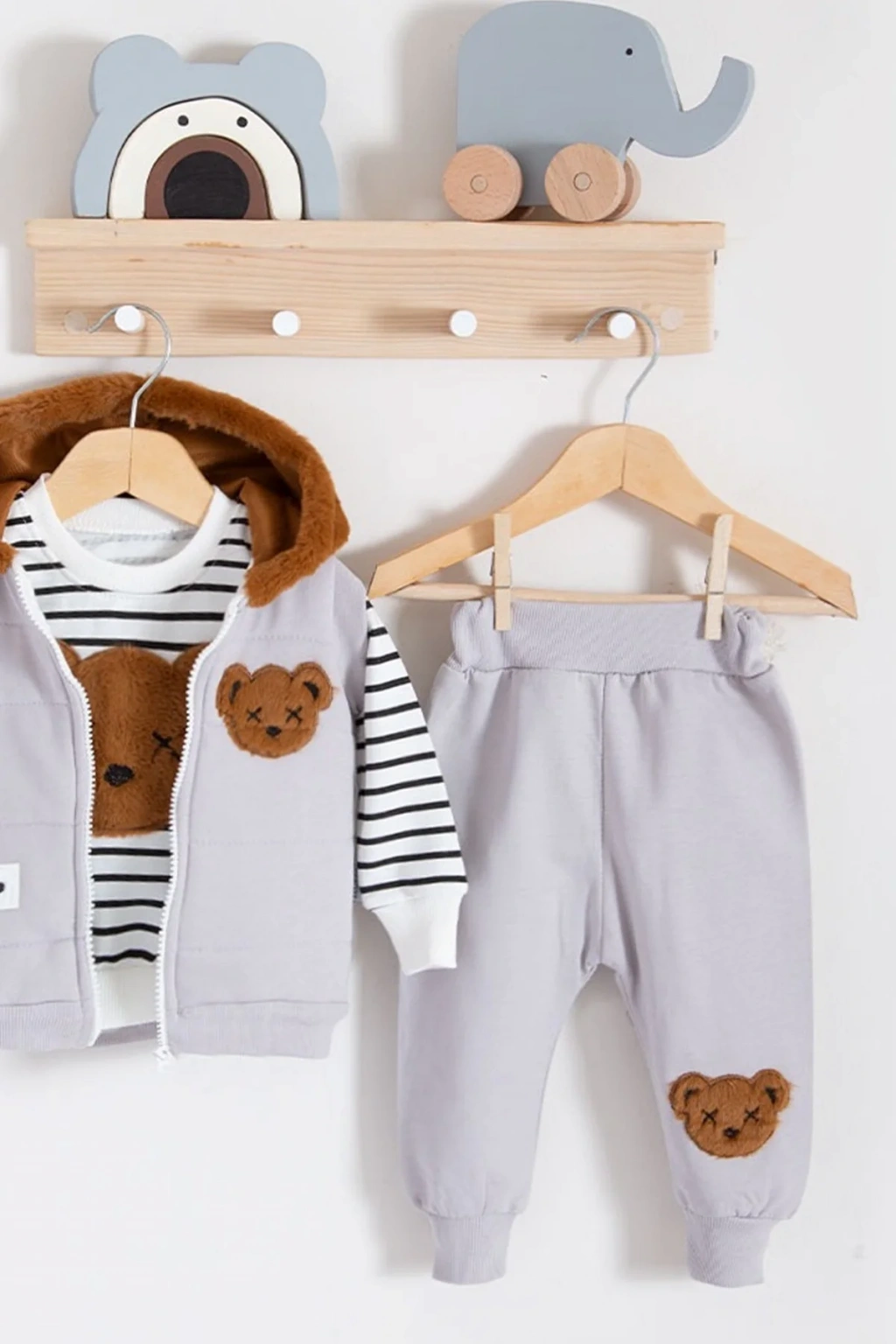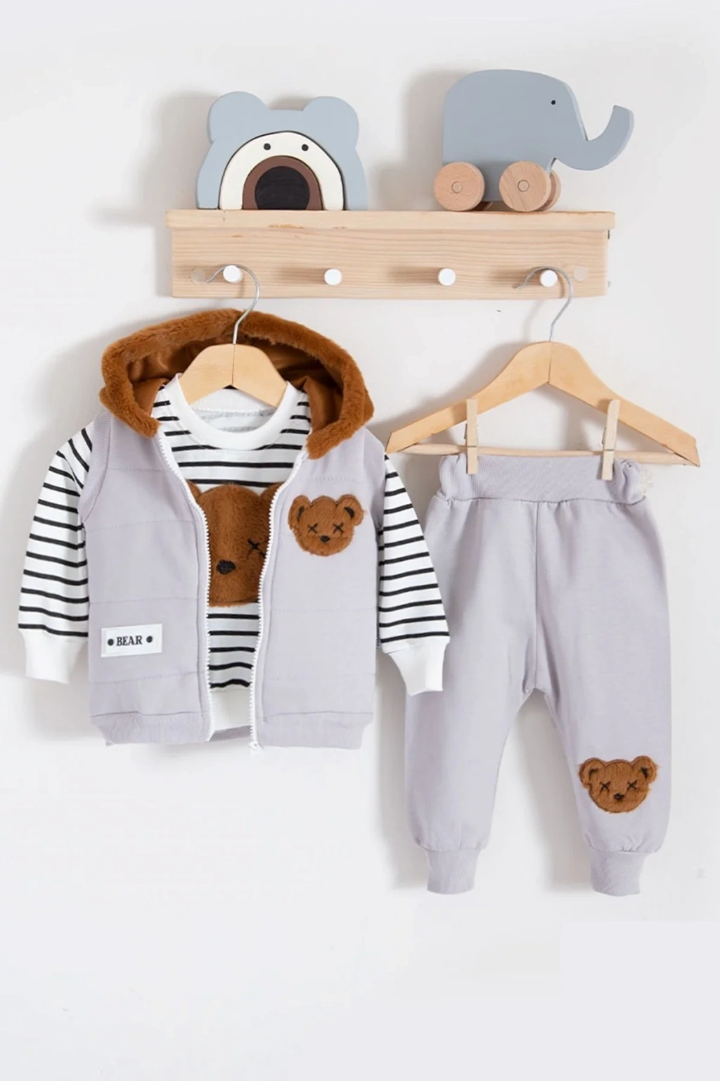 Bear Nakışlı Yelekli 3'lü Erkek Bebek Takımı