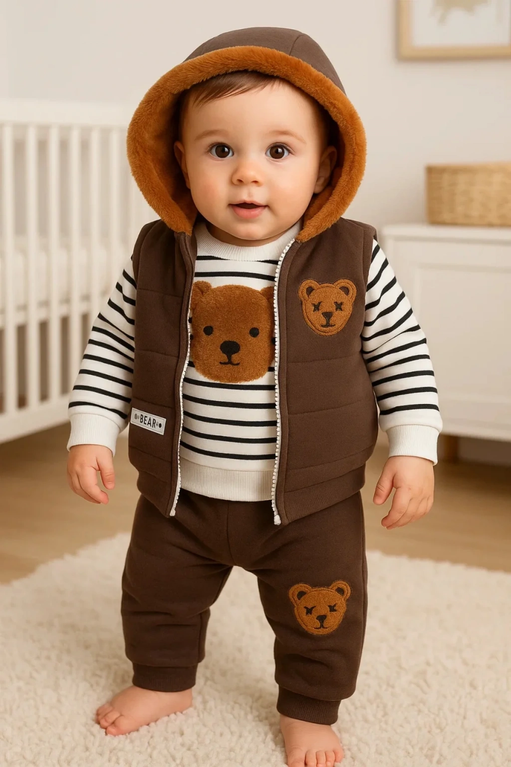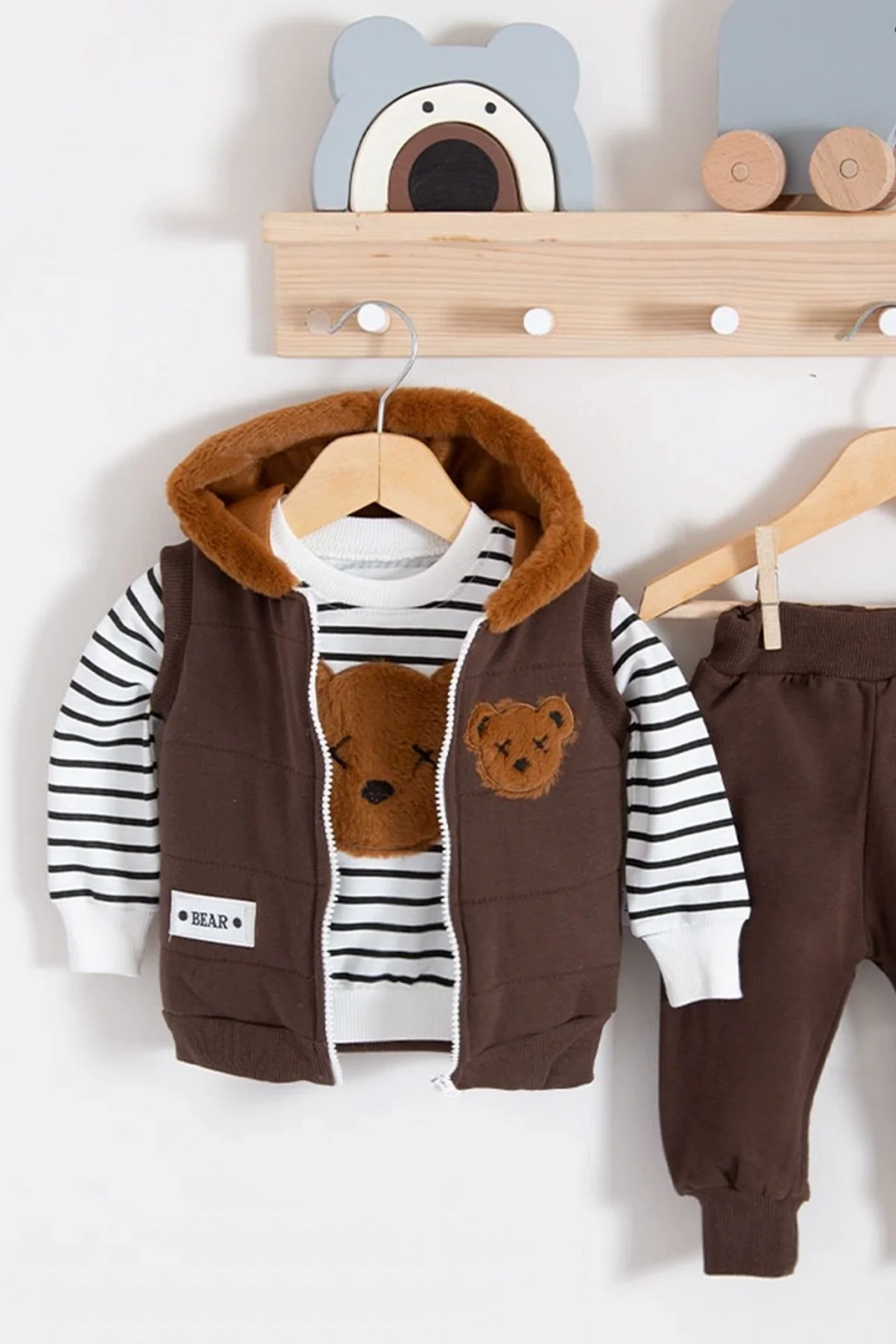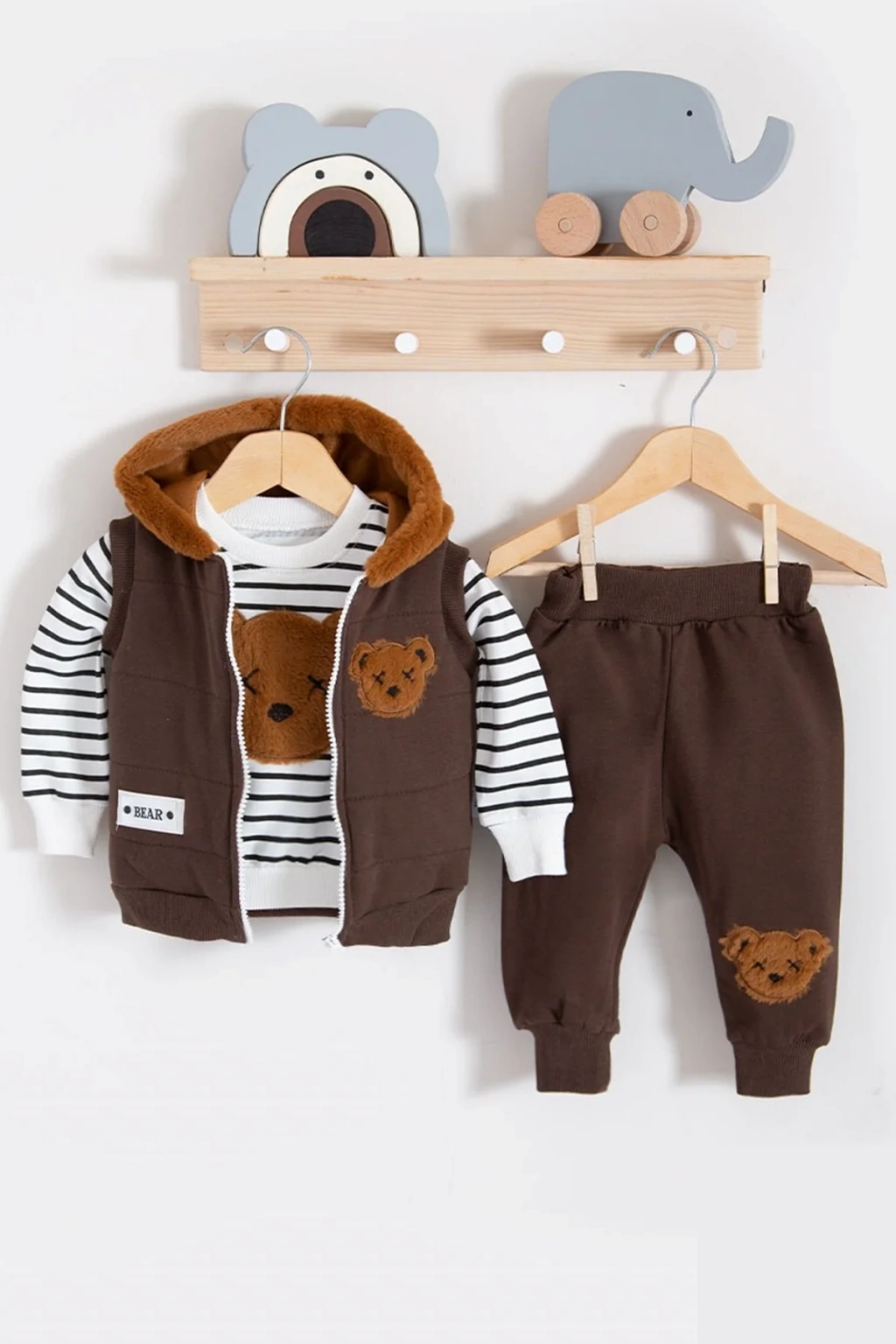 Bear Nakışlı Yelekli 3'lü Erkek Bebek Takımı