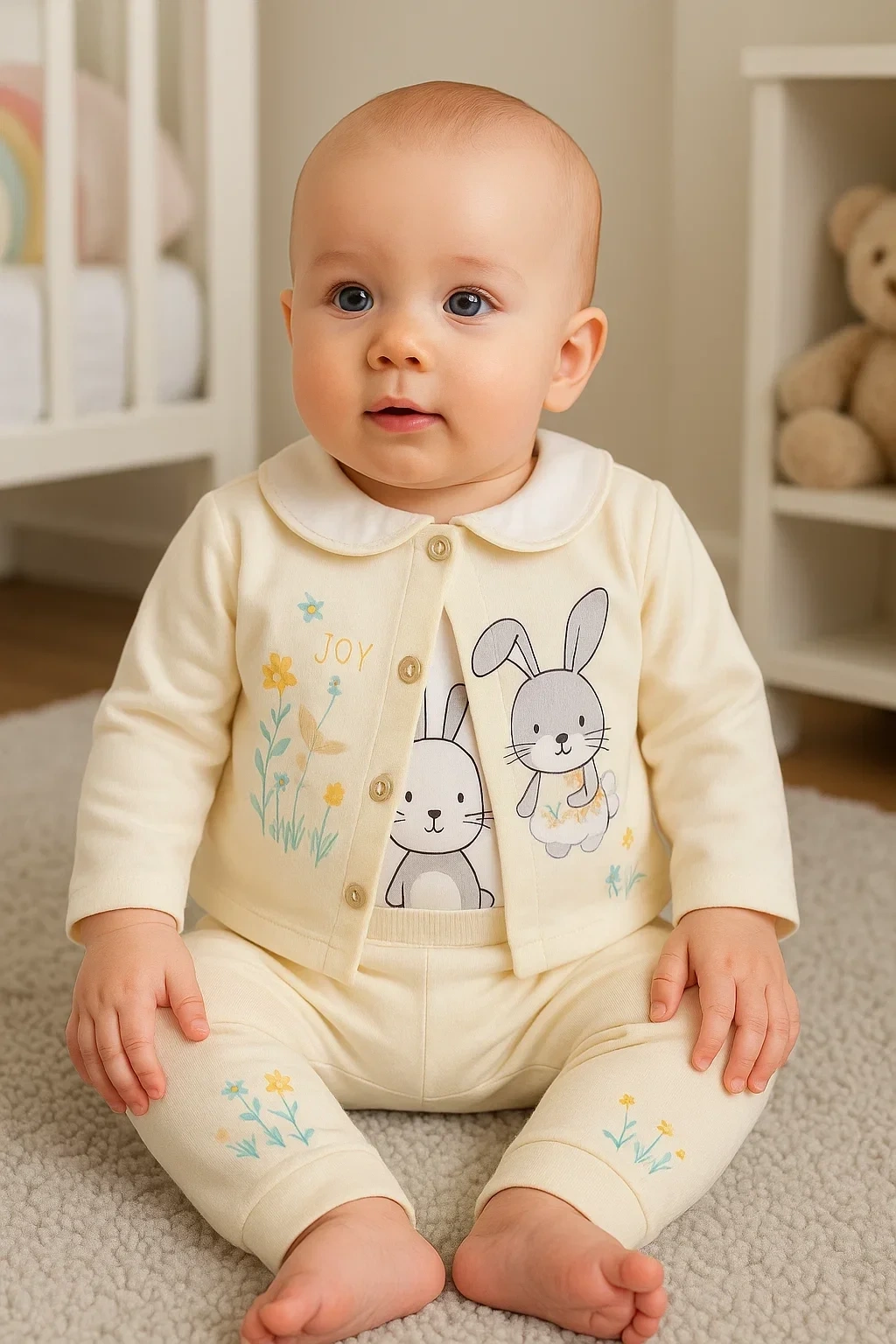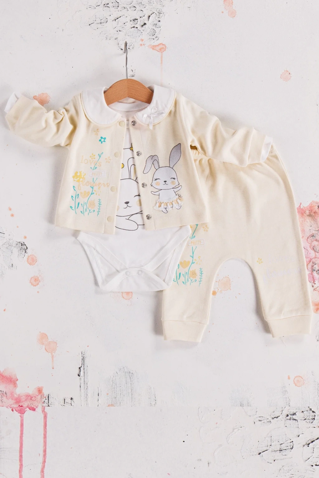 Tavşan Desenli Çiçekli 3'lü Hırkalı Kız Bebek Takım