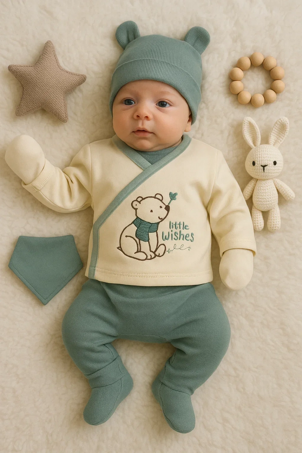 Love Bear Nakışlı 5'li % 100 Pamuk Erkek Bebek Hastane Çıkış Seti